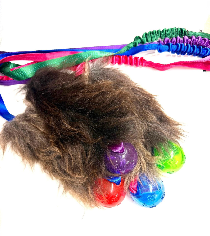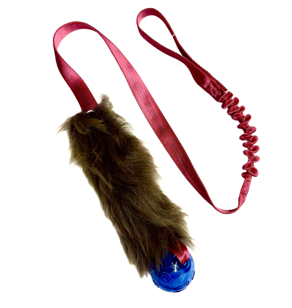 Denne jaktleken fra Doggie-Zen er en morsom og robust leke med elastisk håndtak, saueskinn og og KONG squeezz pipeball.