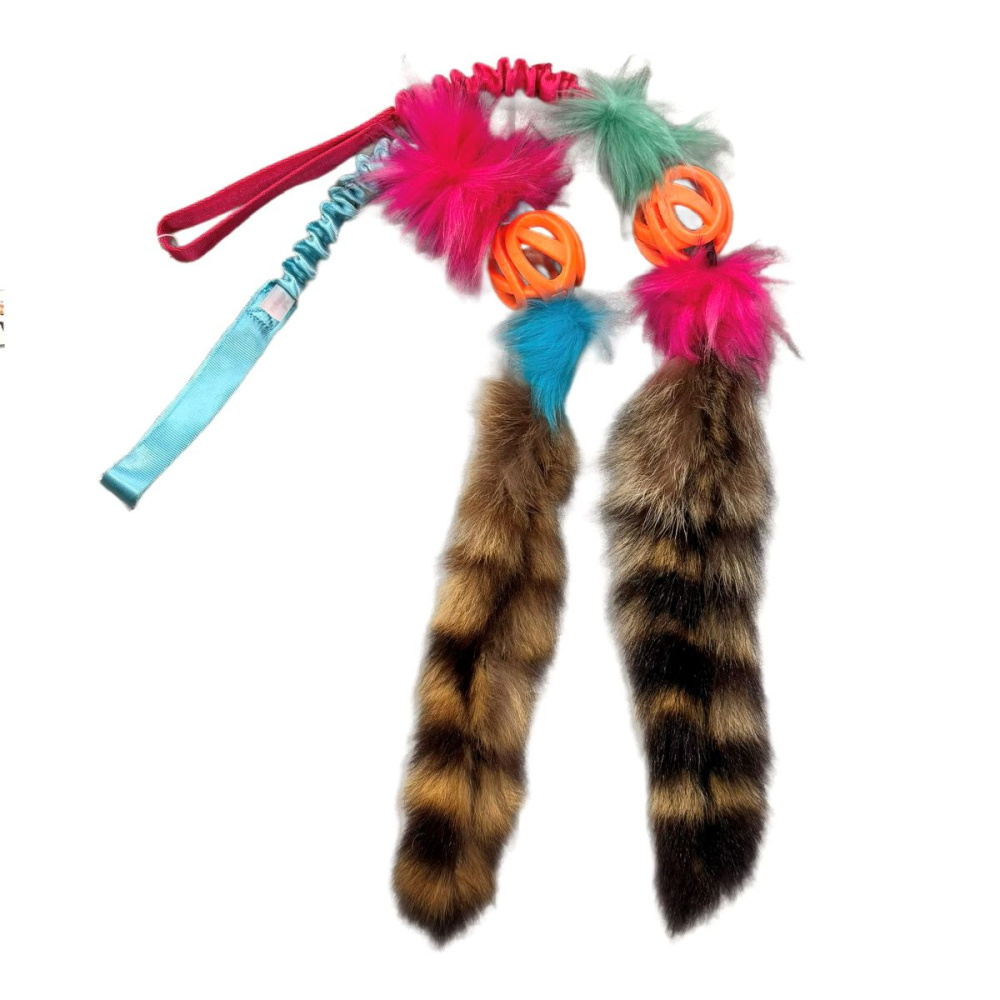 Med strikk, fuskepels, ball og ekte vaskebjørnhale vekker den som regel stort engasjement hos hunden.
