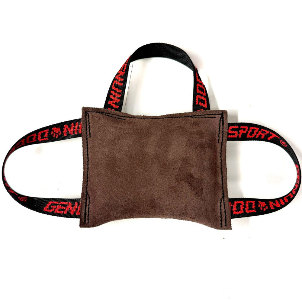 Liten bitepute i lær med tre håndtak. Fin til valpetrening, lydighet, belønning og lett bitearbeid.